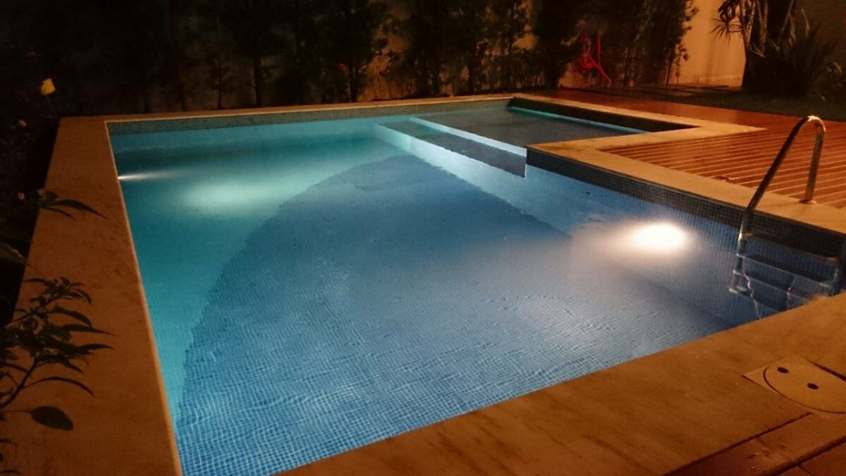Piscina pastilhada com prainha e deck de madeira.