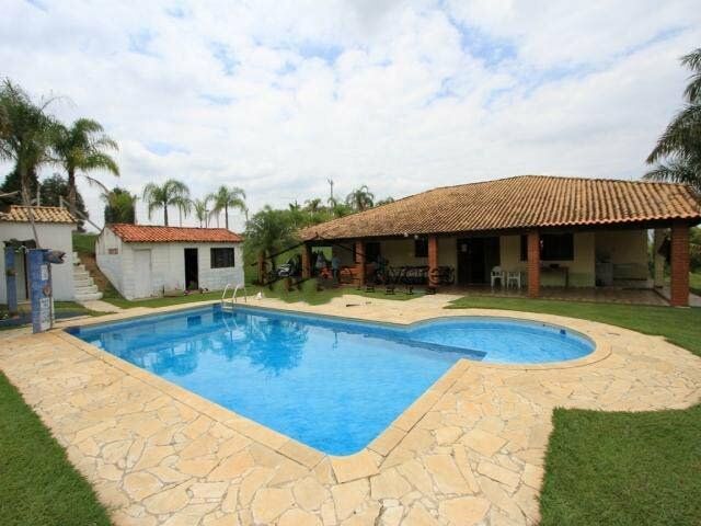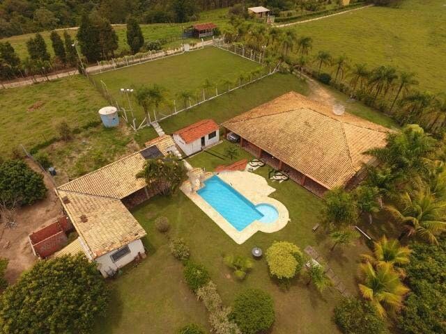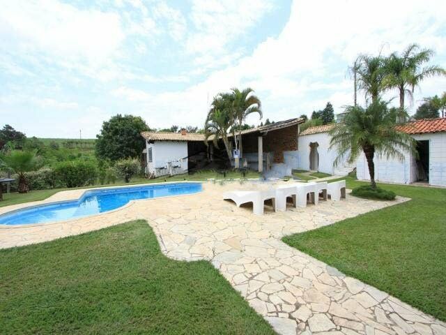 Casa com 4 quartos amplos, 2 banheiros, sala de estar e jantar integradas, toda avarandada, piscina 4 x 8 com prainha e hidro, lago para pesca, pomar formado com mais de 100 árvores frutíferas, poço artesiano, espaço para churrasco e pizza, 3 banheiros externos (vestiário), campo de futebol e quarto para caseiro.